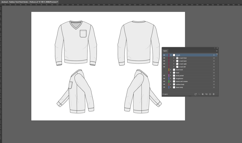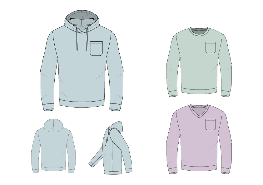 Flat black and white Vector Illustration including .ai and .pdf. Pullover with round neck, v-neck, hood and breast pocket. All including in an easy to use Adobe Illustrator file and grouped in layers.